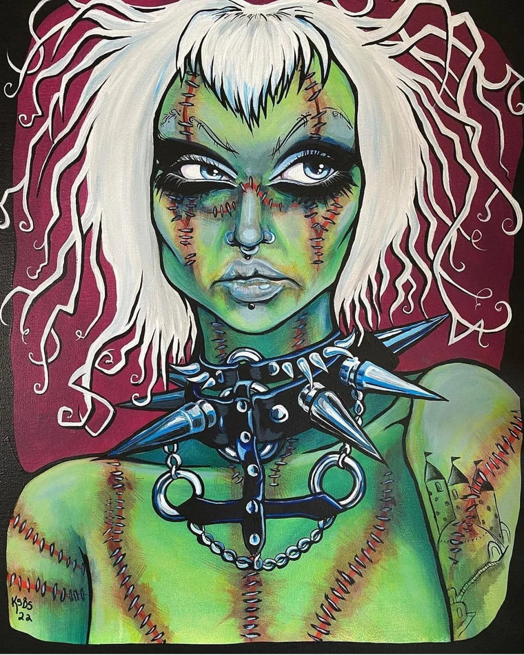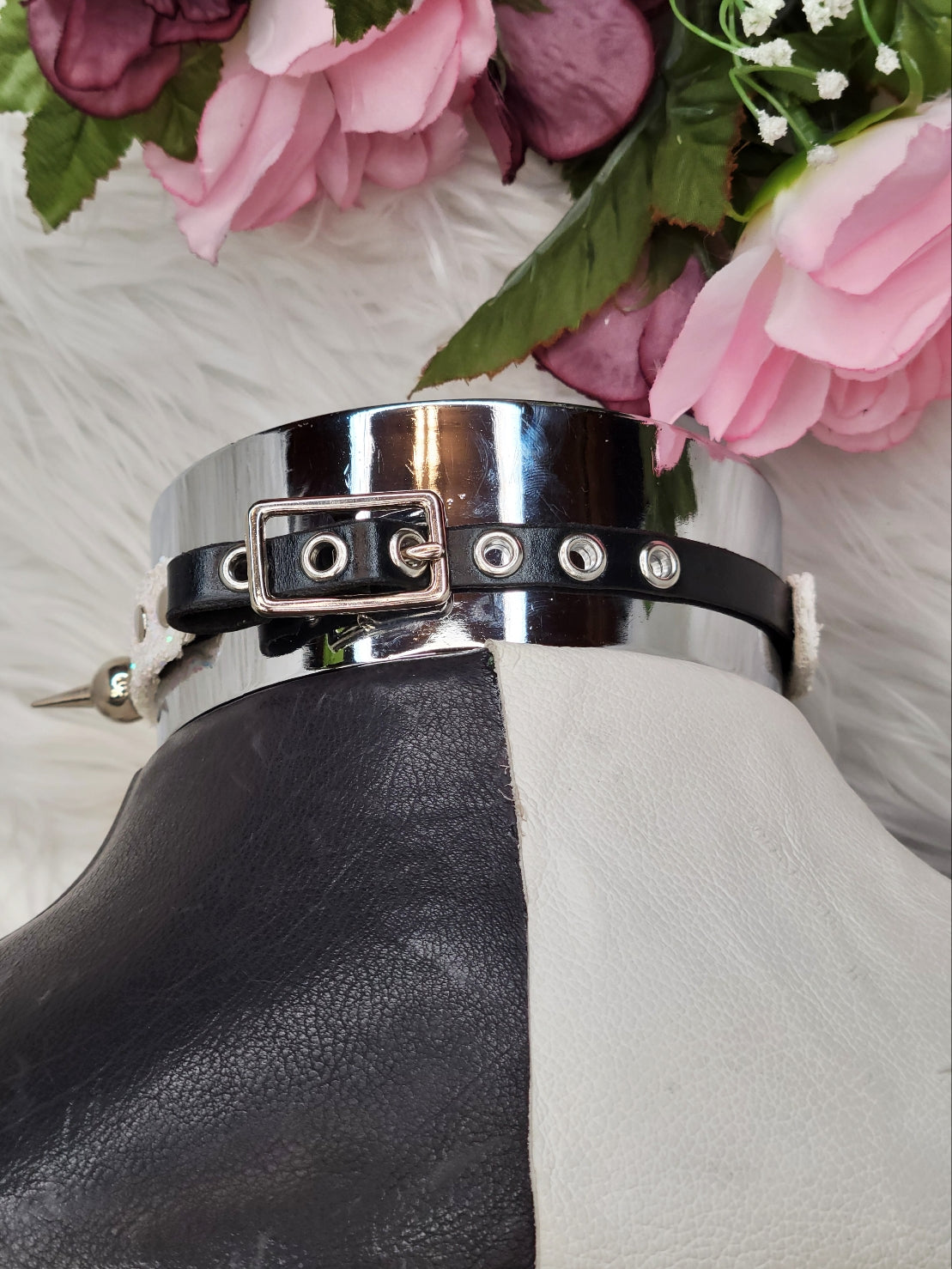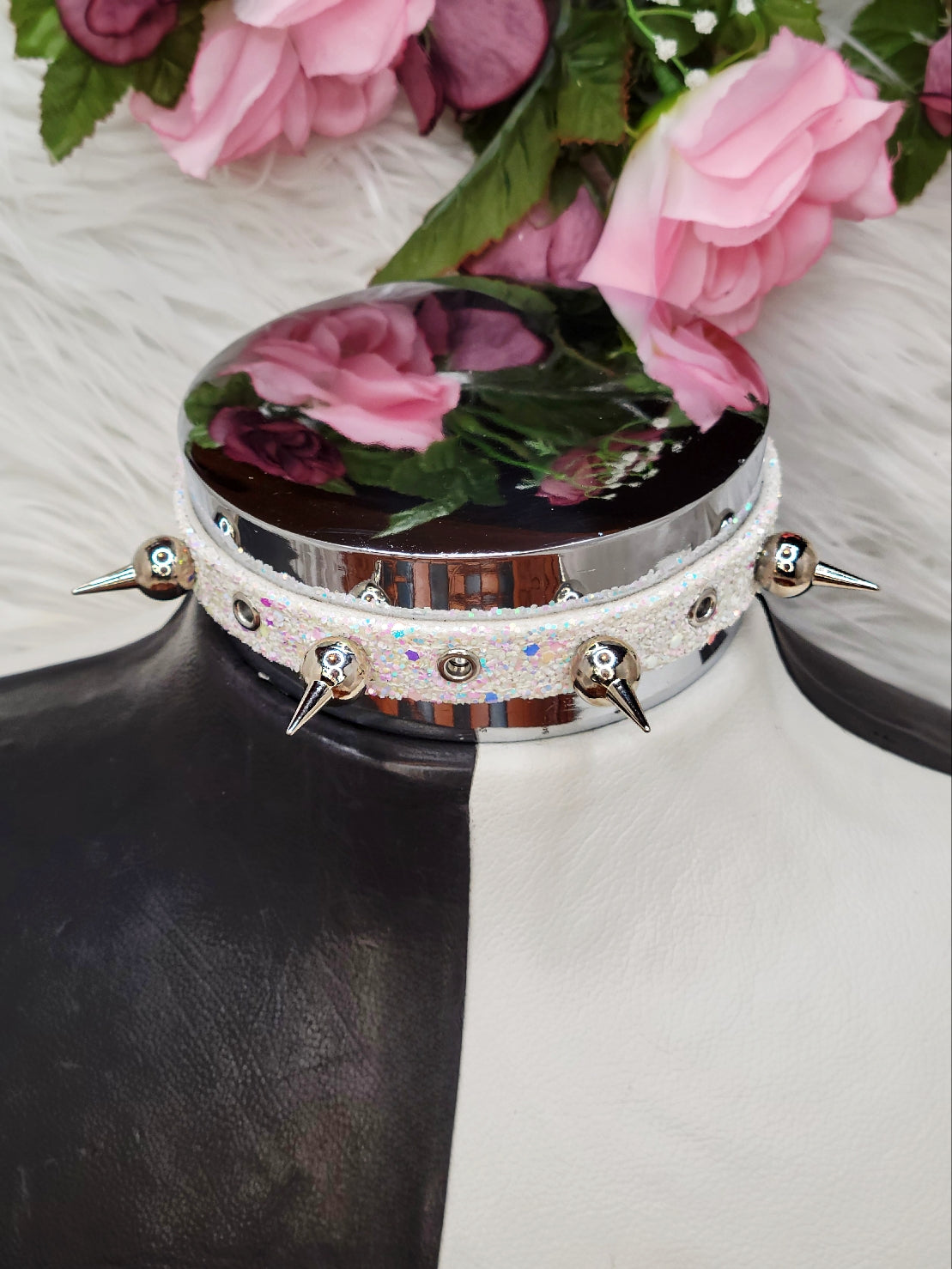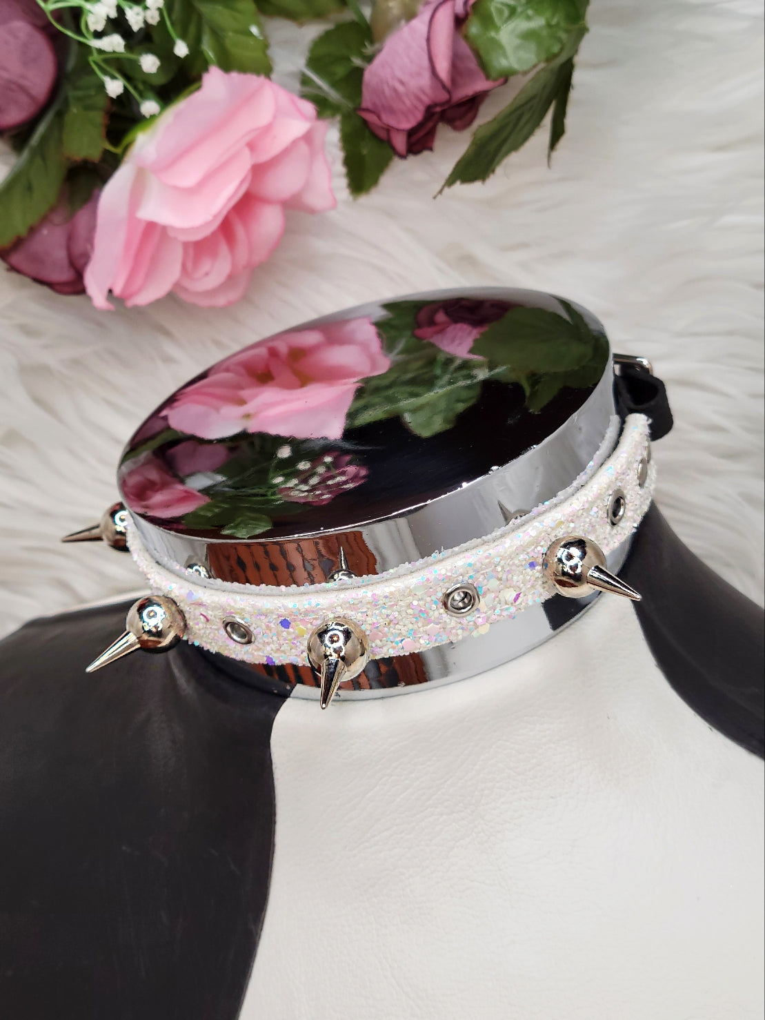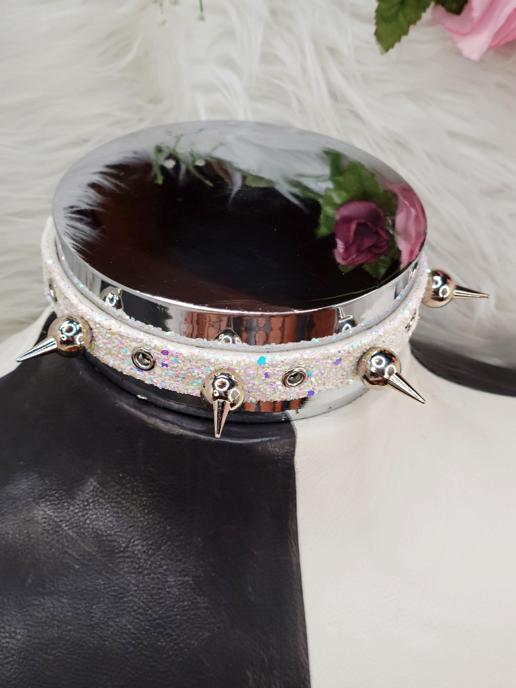 Made with Iridescent Encrusted Glitter Ribbon, machine sewn and lined with Lambskin leather. Strap is 1/2 inch wide. Alternating 1 inch Ball Spikes and 7mm eyelets. End strap is made with Black leather, beveled and burnished edges with Resolene to protect leather and add shine.
